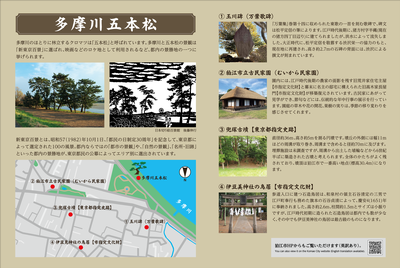多摩川のほとりに林立するクロマツは「五本松」と呼ばれています。多摩川と五本松の景観は「新東京百景」に選ばれ、映画などのロケ地として利用されるなど、都内の景勝地の一つに挙げられます。