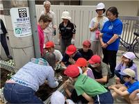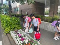いずみ学級の児童が和泉本町一丁目町会や道路交通課の方々と協力し、正門前の花壇に126株の花の苗植えを行った取組です。苗植え作業だけで終わるのではなく、栽培委員の児童も加わり、水やりや雑草抜きを継続的に行っています。