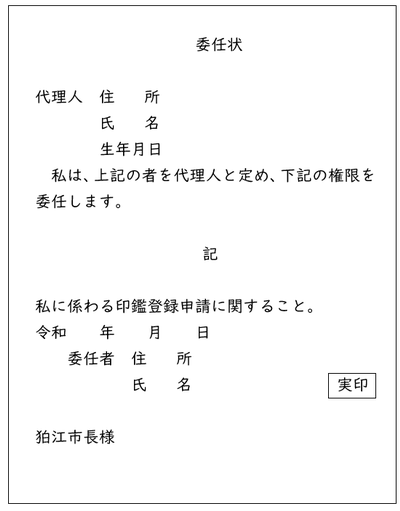 「印鑑登録証」を必ず持参ください。登録印は必要ありません。代理人の場合も委任状等は必要ありません。必要とする方の住所・氏名・生年月日等に誤りがあるときは、証明書は交付できません。