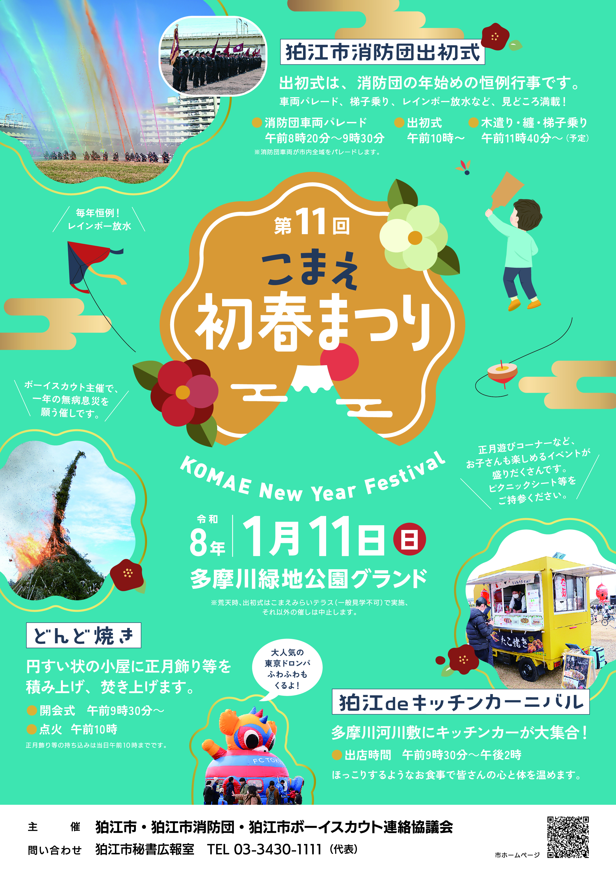 荒天時、出初式はこまえみらいテラスで関係者のみで実施とし、それ以外の催しは中止します。
