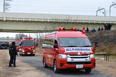 消防団ポンプ車両が多摩川緑地公園グランドを出発し、市内全域をパレードします。