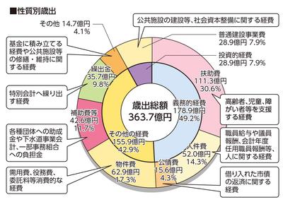 普通会計の歳出総額は、前年度比5.6%増の363億6,570万6千円となりました。