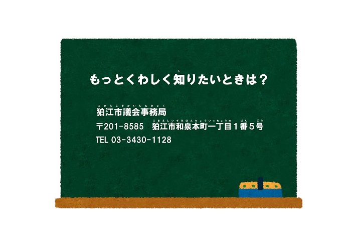 狛江市議会のことをもっと知ってもらうためのページです。市議会は、狛江市をよりよくするために大切な役割をしています。 このページを見て、市議会についていっしょに学び、考えましょう!