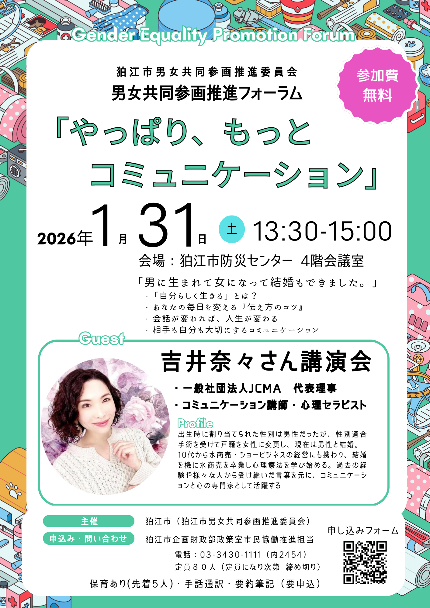 (2)男女共同参画推進フォーラムについて -資料1・資料2に基づき事務局より説明- ・男女共同参画推進フォーラムで、吉井奈々さんにお願いする講演内容について、ご意見を伺いたい。 (委員)「相手も自分も大切にするコミュニケーション」は委員会のテーマに合っている。 せっかく男女共同参画推進委員会の内容であるので、「人を大切にする物言い」等について教えていただきたい。「こういう言い方はやめて、こういう言い方にしよう」等の言い換えや、吉井さん自身が、こういう言い方をされて嫌だった、又はこういう言い方をされて嬉しかった等についても伺いたい。 (委員)男性に生まれて女性になったということであるので、男性として過ごされてきた時代と、女性に変わってから現在まで、コミュニケーションの中で、嫌だと思うこともたくさん経験されてきたと思う。男性だった時はどんな時に嫌だと感じ、それが女性の立場になったとき、周りとの関わりがどう変わったのかという変化にもとても興味がある。性の違いによって感じた変化についてお聴きしたい。 (委員)両性の立場(視点)について話されると思うが、一方、どちらの性でも変わらないコミュニケーションもあるのではないか。分かり合えないのは、性別の違いではなく、前提のズレ、認識のズレを軸として男女で見え方の違いがあるとしても、男女の違いだけでなく、同性、同世代であってもコミュニケーションがズレてしまう時がある。それは、相手も自分も大切にするコミュニケーションにヒントがあるのかも知れないが、例えば「言わなくても伝わるよね」「言わなくても分かるでしょ」等でズレが生まれてしまう。 また、正しいことを指摘しているが、言い方や、立場によってその言葉を言われた人に深く入ってしまう、若しくは軽んじられるなど、立場や目的によりズレが生じる。 善意が衝突に変わる場合や、大事にしているものの違いによって「昔からこうなんだよね。」と「それは、今は違うよね」という衝突など。どちらも正義で話しているが、大事にしているものの違いでズレが生じている。性別以外の色々な人の立場や状況でちょっとしたズレが生じてしまうかもしれない。それらを包括したコミュニケーションのいろは(ポイント)について、具体的な事例を交えてお話しいただけると、分かりやすい。 (委員)性的少数者の友人がいる。出生は男で手術をして女性になったが、女性になった後も心と体のバランスが難しい様子であった。もう一人は身体障がい者で男性に生まれ、女性になった人。子供の時に障がい者差別があり、辛い時期を過ごしたが、大人になり、性的少数者の友人たちと出会って人生が変わり、幸せだと話していた。いろいろな立場や状況の人がいる。みんな仲間であることを知らせてほしい。 (委員)経営側で仕事をしているため、現場(職場)で使えるコミュニケーションやマネジメント等も伺えると良いと思った。 (委員)来場される方の性別や年齢層、職層等によって、内容を検討してはどうか。 (事務局)年齢、性別については、申込みの時点で確認していないため、難しい。 ご意見のあった内容を吉井さんにお伝えする。